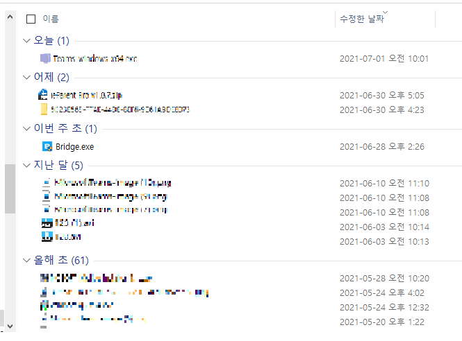 윈도우10 1903 버전으로 업데이트하고 다운로드 폴더를 보면 다운로드한 파일들이 수정한 날짜 기준으로 분류되어 있습니다. 파일이 수정된 날짜 기준으로 분류되어 있으니 예전이었다면 수정한
