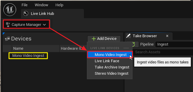 드롭다운 메뉴로 Capture Manager를 선택 ---> Add Device에서 Mono Vider Ingest 선택을 하면