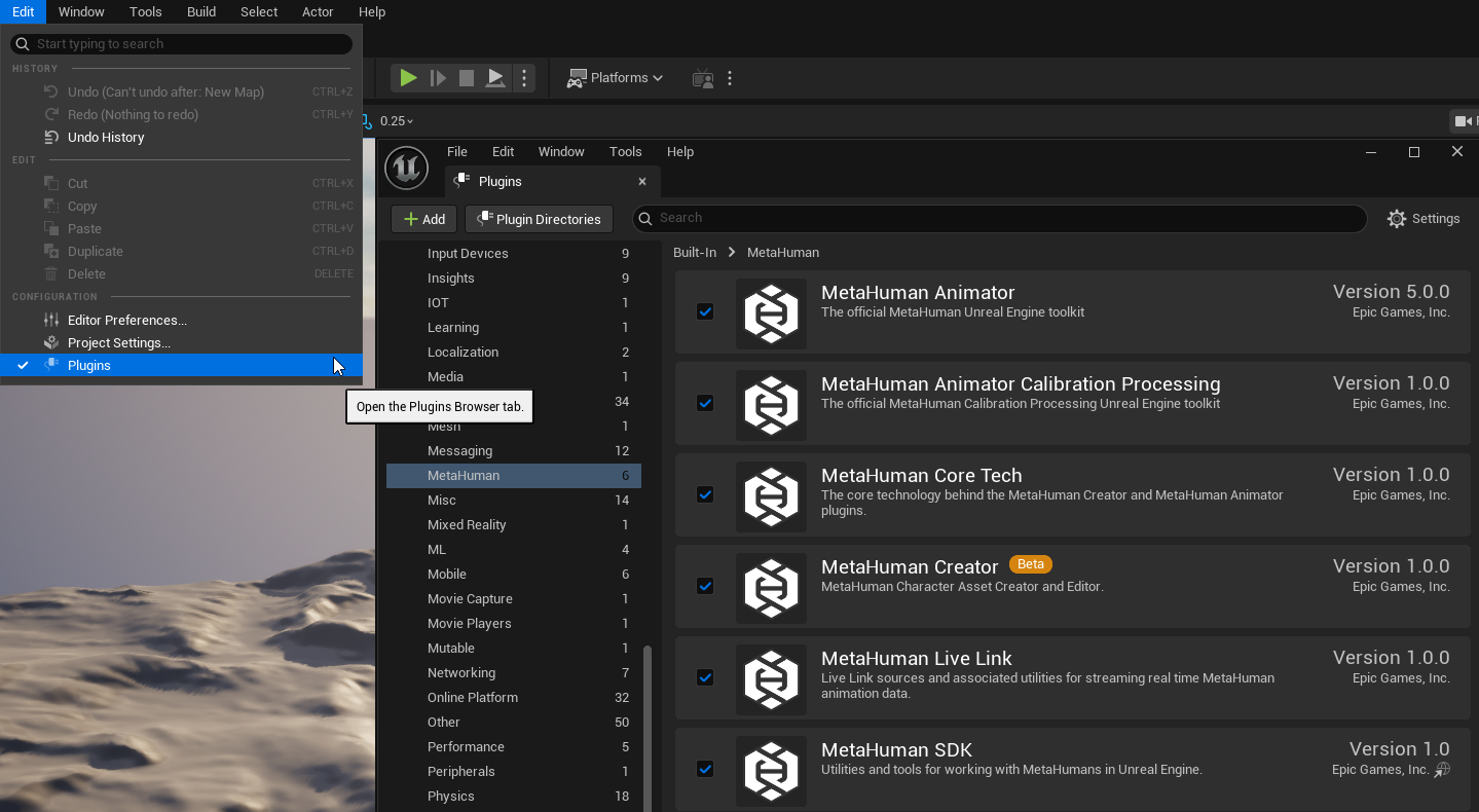 언리얼 플러그인 탭에서 메타휴먼 관련 플러그인 켜 져 있는지 확인.
